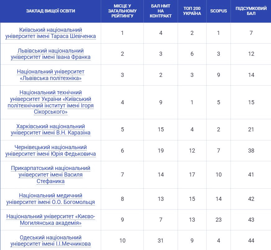 Згідно з рейтингом, перше місце посідає Київський національний університет імені Тараса Шевченка, який утримує лідерство серед українських університетів вже вісім років.