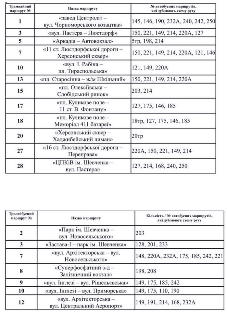Внаслідок ворожих атак, Одеса стикається з серйозними проблемами у транспортному сполученні. Всі електричні підстанції залишаються без електрики, що призвело до зупинки трамваїв та тролейбусів. Пресслужба Одеської міськради повідомила про ситуацію. Для забезпечення транспортних послуг в умовах відсутності електропостачання, перевізникам наказали збільшити кількість автобусів на міських маршрутах, а також організувати соціальні рейси, які замінюють електротранспорт. На трьох основних трамвайних напрямках запустили соціальні автобуси. Наприклад, автобуси, що курсують від залізничного вокзалу до вулиці 28-ї Бригади, мають інтервал близько 30-40 хвилин. Також, на маршруті трамвая №5, який проходить від вокзалу до Аркадії через Французький бульвар, працюють автобуси з інтервалом близько години. Додатково, між станціями «11 станція Великого Фонтану» та «16 станція Великого Фонтану» курсують автобуси, що дублюють рух трамваїв №17 та №18 з інтервалом до 60 хвилин.