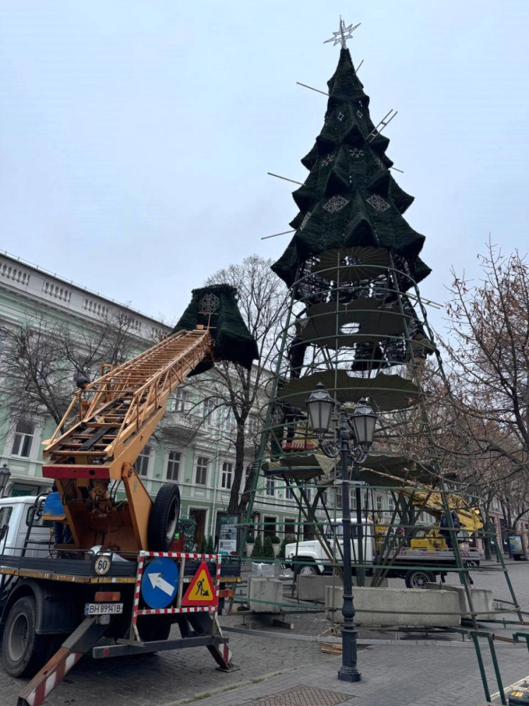 У Одесі триває підготовка до святкування Нового року та Різдва. Вчора розпочалися роботи з монтажу головної ялинки на Дерибасівській вулиці.