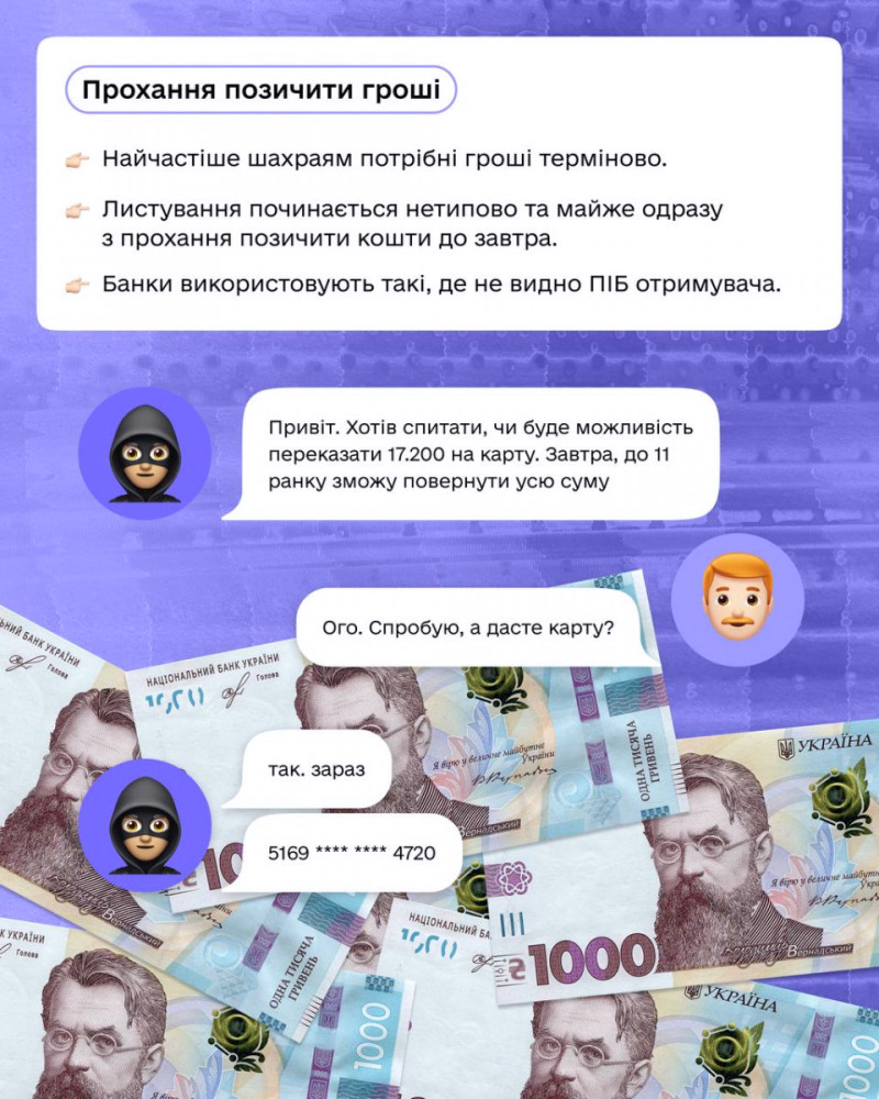 Зловмисники використовують різні методи фішингу, щоб обманювати людей, наприклад, надсилаючи повідомлення з проханням про фінансову допомогу або підтримку в конкурсах.