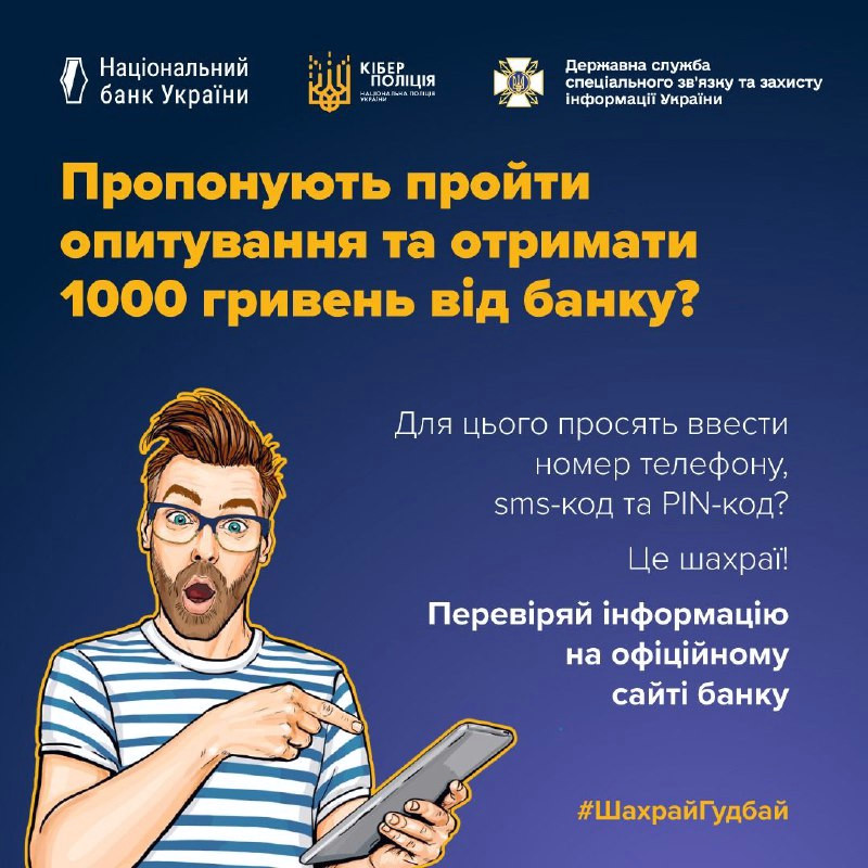 Останнім часом у соціальних мережах та месенджерах з'явились шахрайські повідомлення, які нібито надходять від банку, пропонуючи «грошову винагороду» за участь в опитуванні.