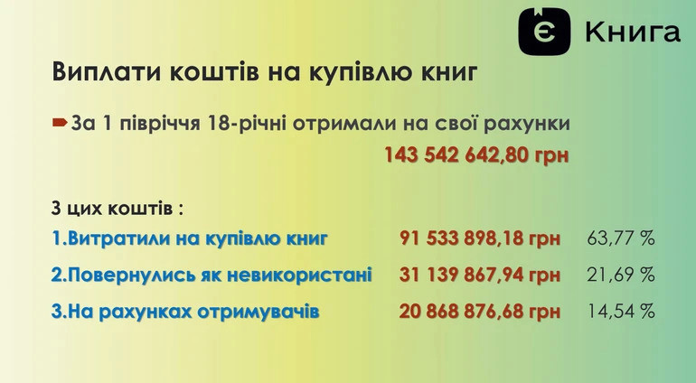 "Приблизно 20,12% учасників програми отримали кошти на картку, але не витратили їх на книги. Причини можуть бути різні, зокрема незнання про терміни використання коштів (гроші можна витратити протягом 3 місяців з моменту зарахування). Невикористані кошти знову спрямовуються на програму — передаються наступним 18-річним учасникам, які зареєстровані в програмі", – зазначили в УІК.