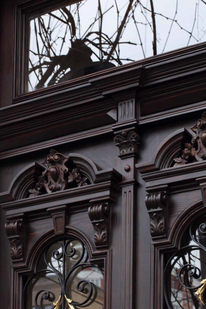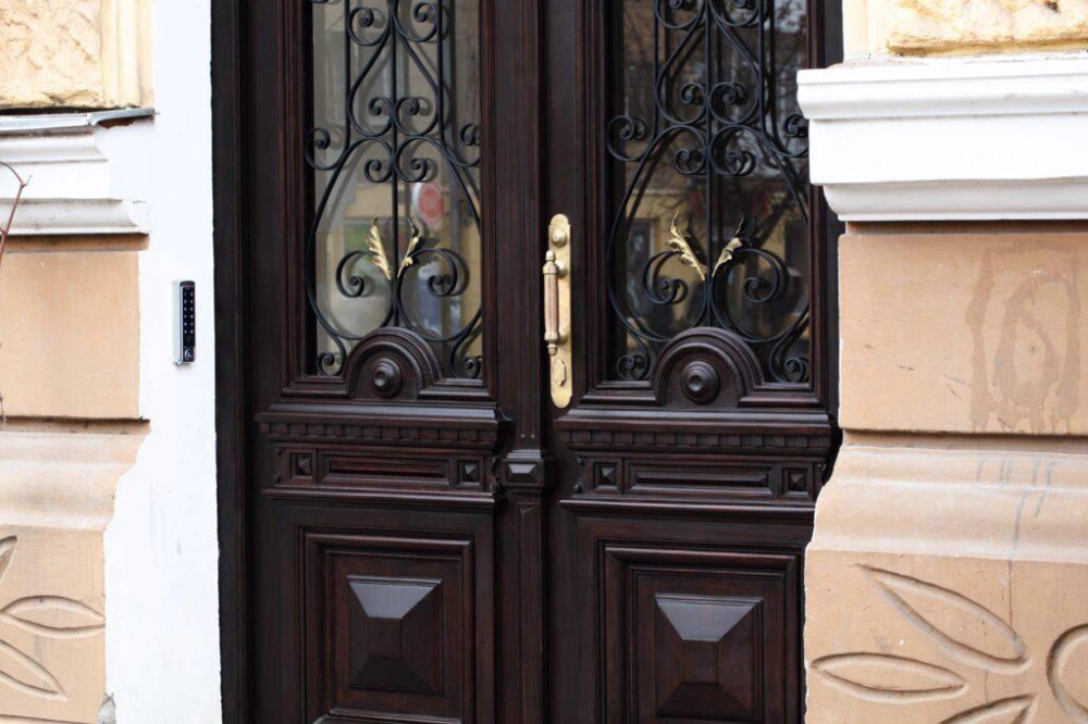 Для цього проекту майстри відтворили автентичні шпингалети, частково відреставрували металеві решітки, а також інтегрували сучасний електричний замок і доводчик, щоб двері були зручними та надійними.