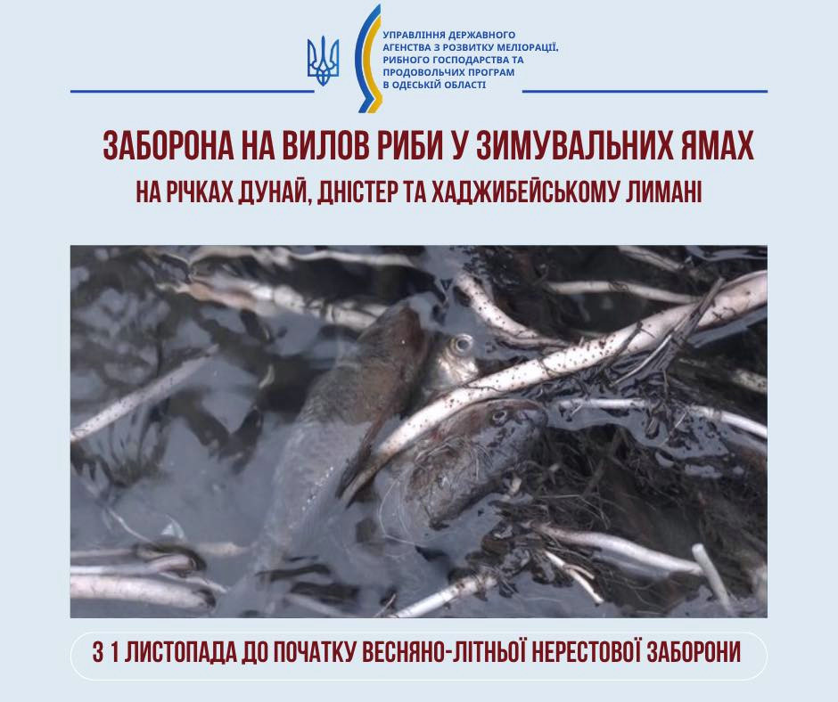 З 1 листопада у водах Одеської області запроваджено заборону на вилов риби в зимувальних ямах, щоб захистити водні біоресурси під час зимового періоду.